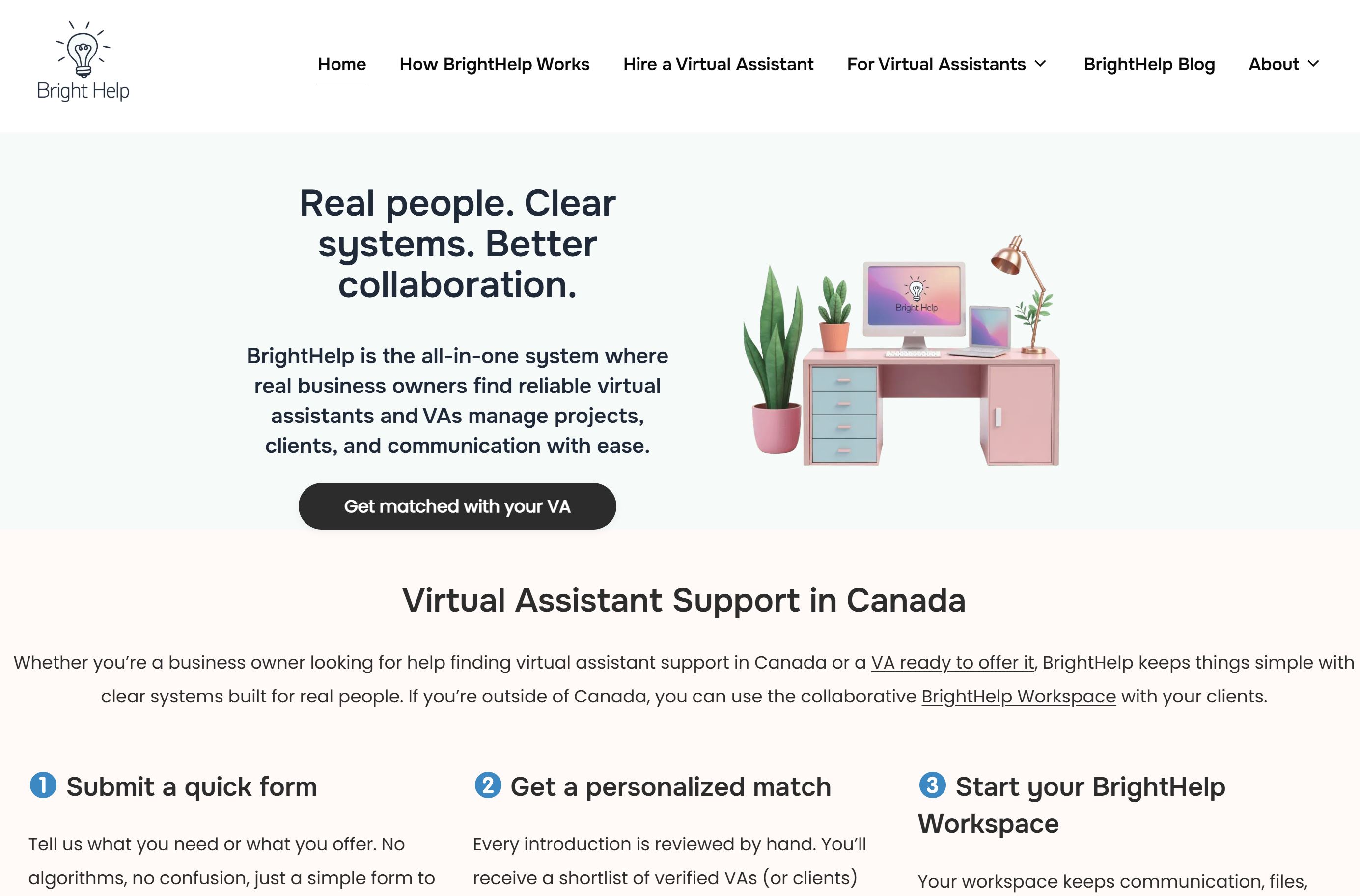 BrightHelp connects Canadian small business owners with reliable virtual assistants and gives them both a structured workspace to manage tasks, communication, and client projects.