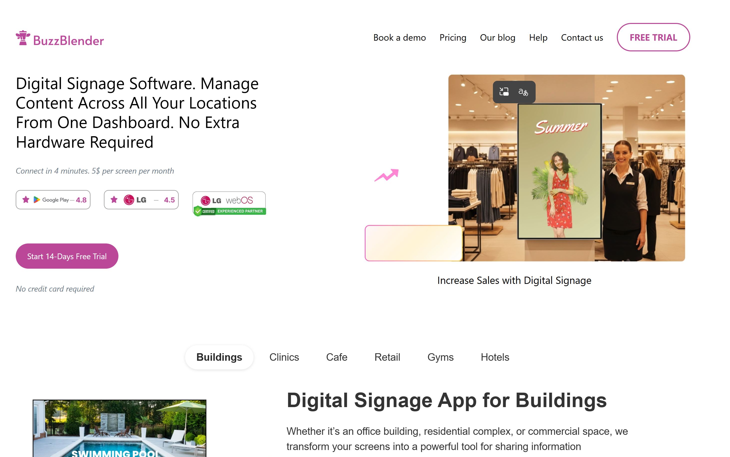 "BuzzBlender - hardware agnostic digital signage software. We built it specifically for small businesses that were tired of overpriced or overly complex signage tools. * Quick setup — most people are up and running in minutes * Pricing starts at $5 per screen/month"