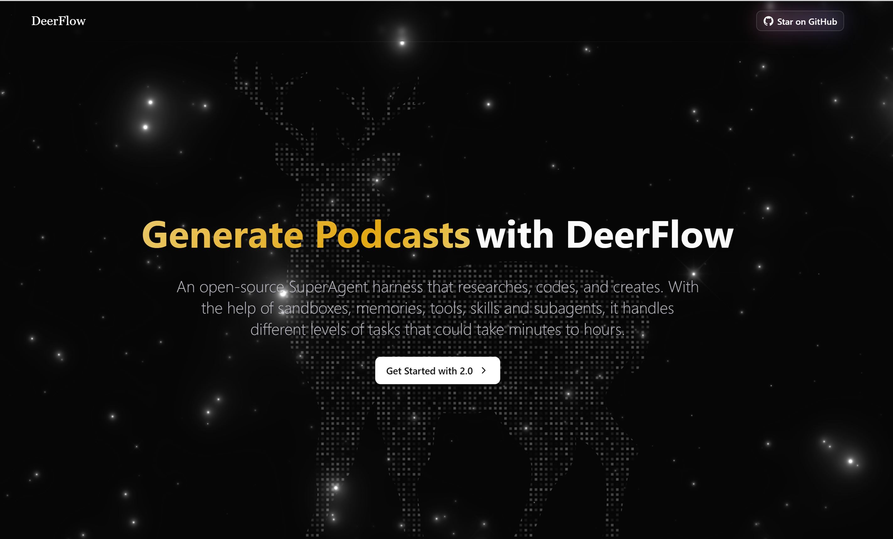 An open-source. SuperAgent harness that researches,codes, and creates. Withthe help of sandboxes,memories,tools, skills and subagents,it handlesdifferent levels of tasks that could take minutes to hours.