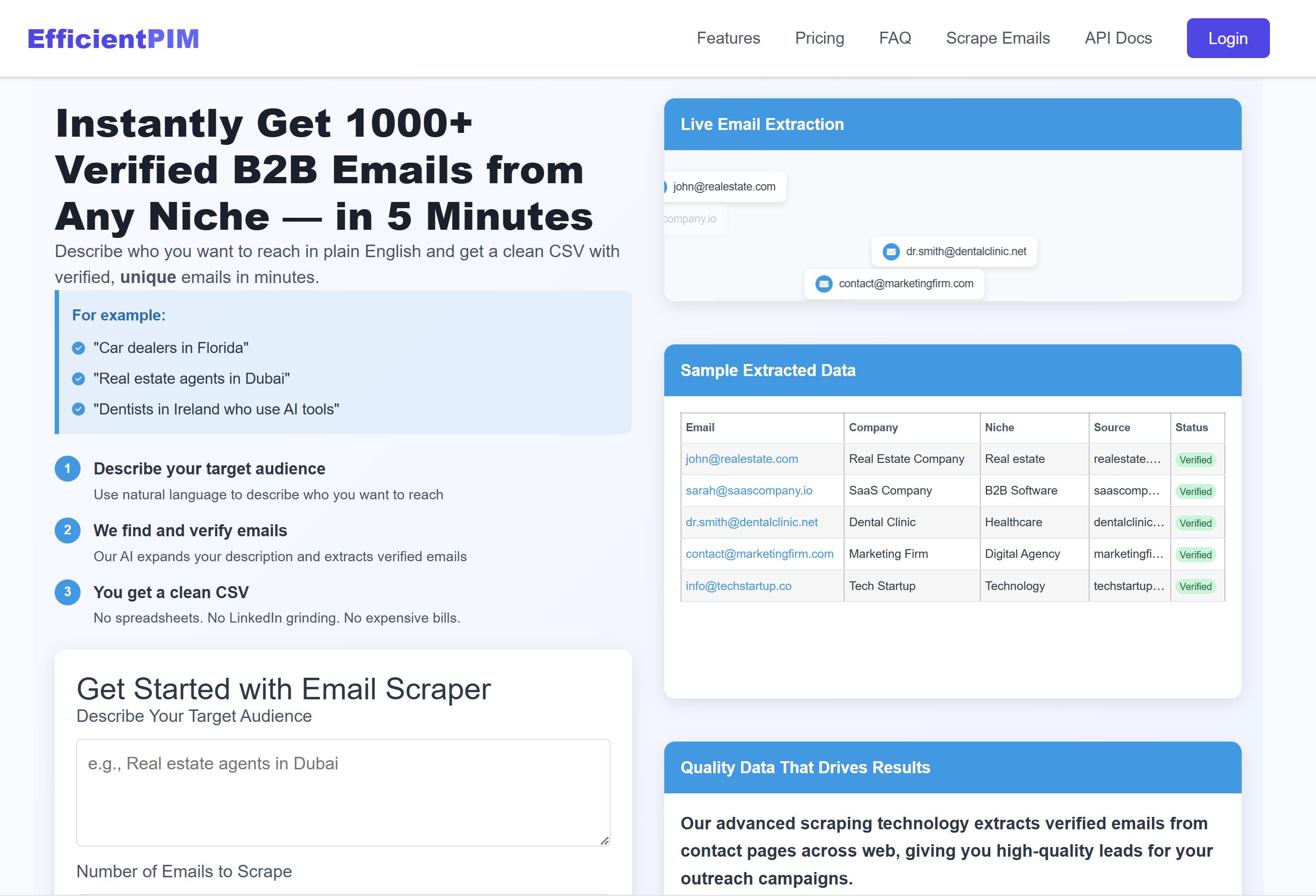EfficientPIM: AI-powered B2B email scraper & API. Describe your target in plain English (e.g., "SaaS founders in Germany"). Get verified, unique leads in CSVโ95% accuracy, global support, no duplicates. Ready for HubSpot, Salesforce & more