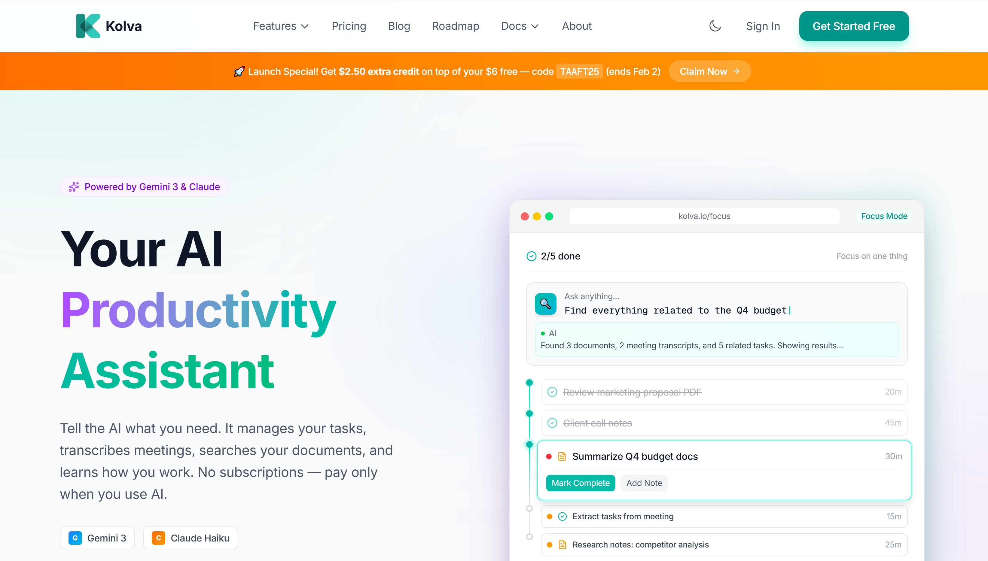 Kolva is an AI-powered workspace for tasks, documents, notes, and meetings. One AI that schedules, transcribes, searches, writes, and answers—ask it anything. AI that helps you work—not just organise.