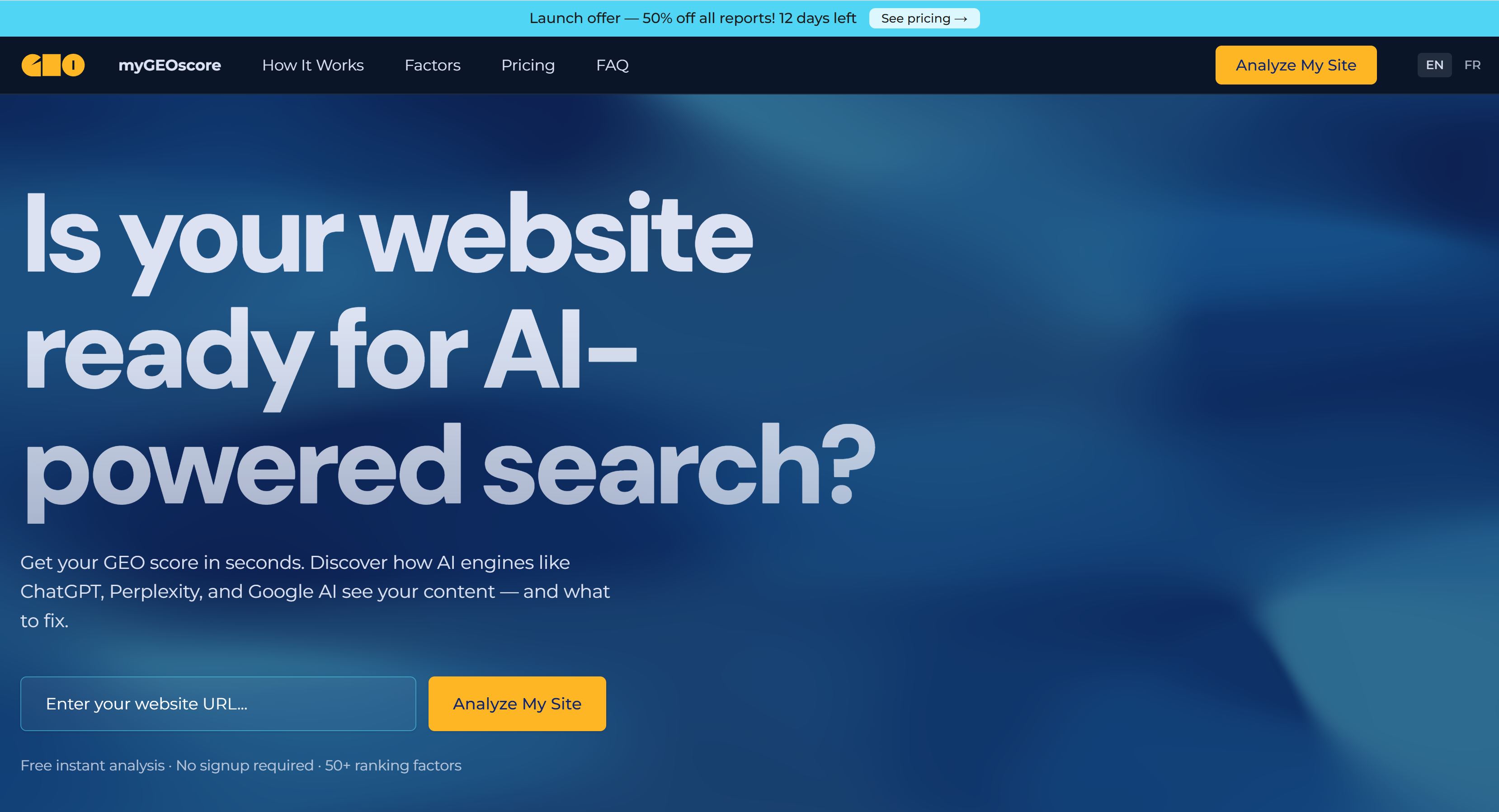 Paste a URL and score your website across 52 factors for AI search visibility. Get a letter grade, category breakdowns, and a prioritized action plan so ChatGPT, Perplexity, and Google AI can find and cite your content. Free tier + full report for $19.