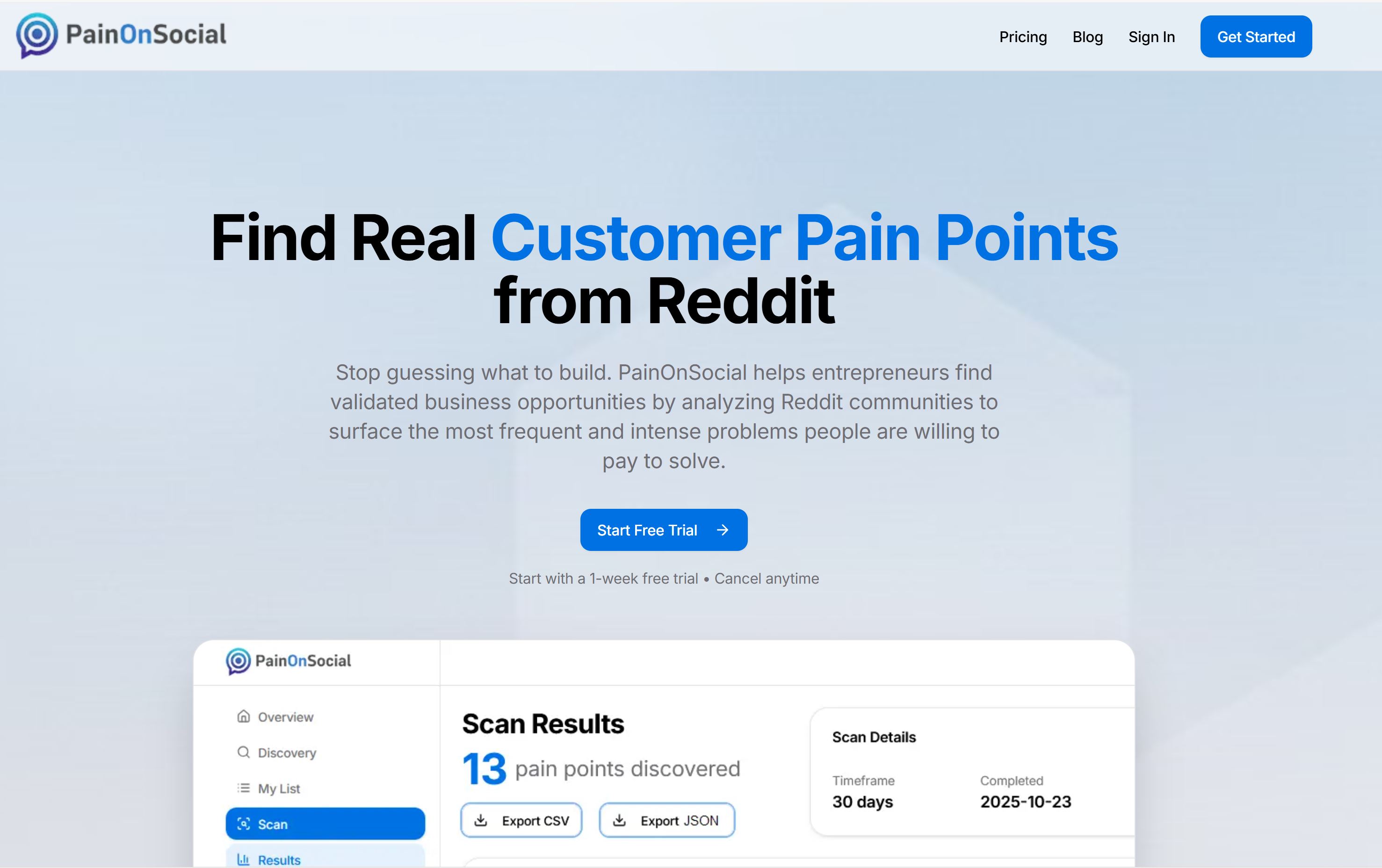 PainOnSocial helps you quickly discover what customers are struggling with by scanning Reddit and other social platforms, then turning real complaints and questions into clear opportunities.