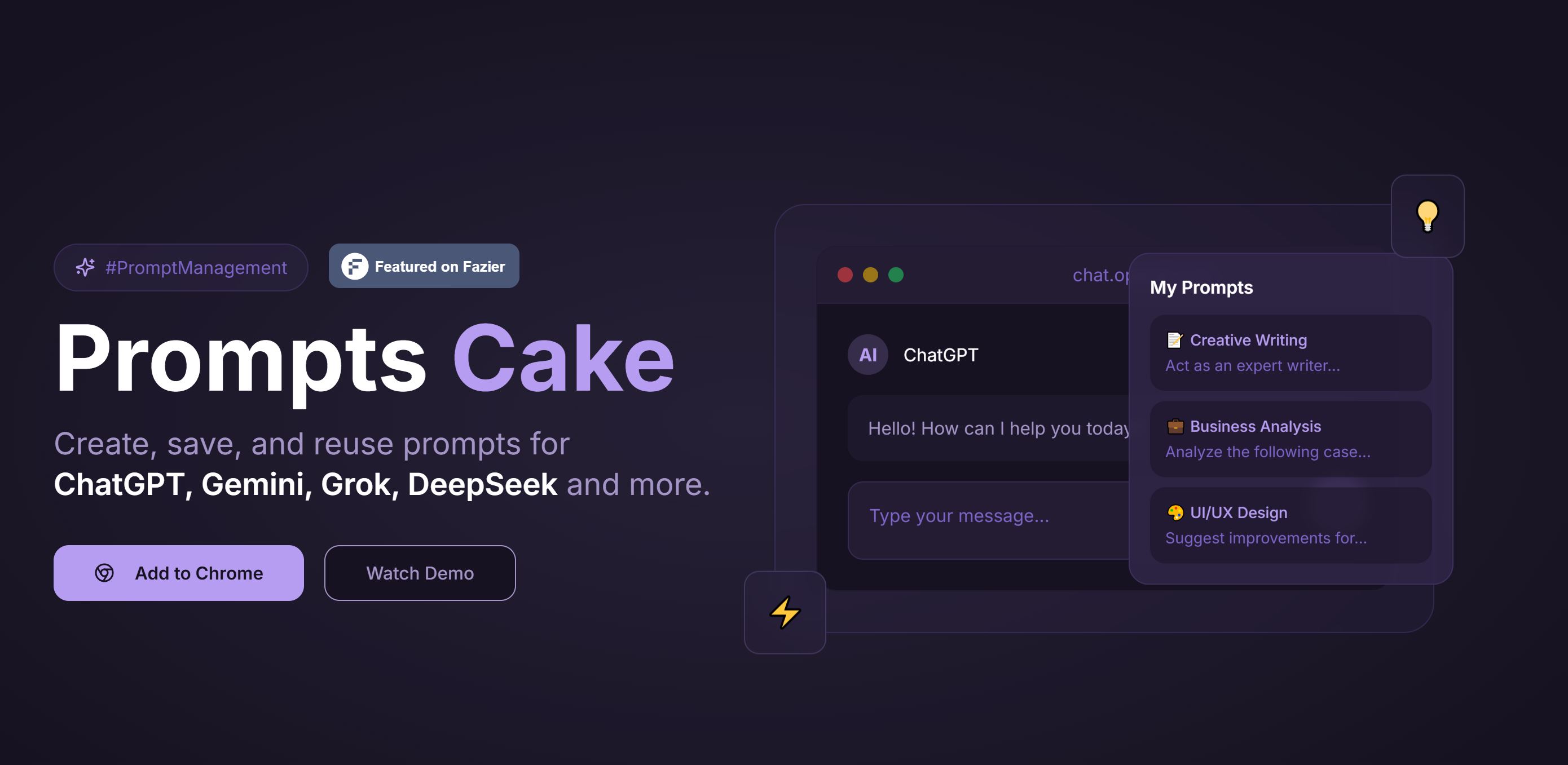 Create reusable AI prompts with dynamic variables for ChatGPT, Gemini, Grok & more. Our Chrome extension lets you save smart templates and adapt them with custom inputs. Access in one click, streamline workflows across platforms, and stop rewriting.