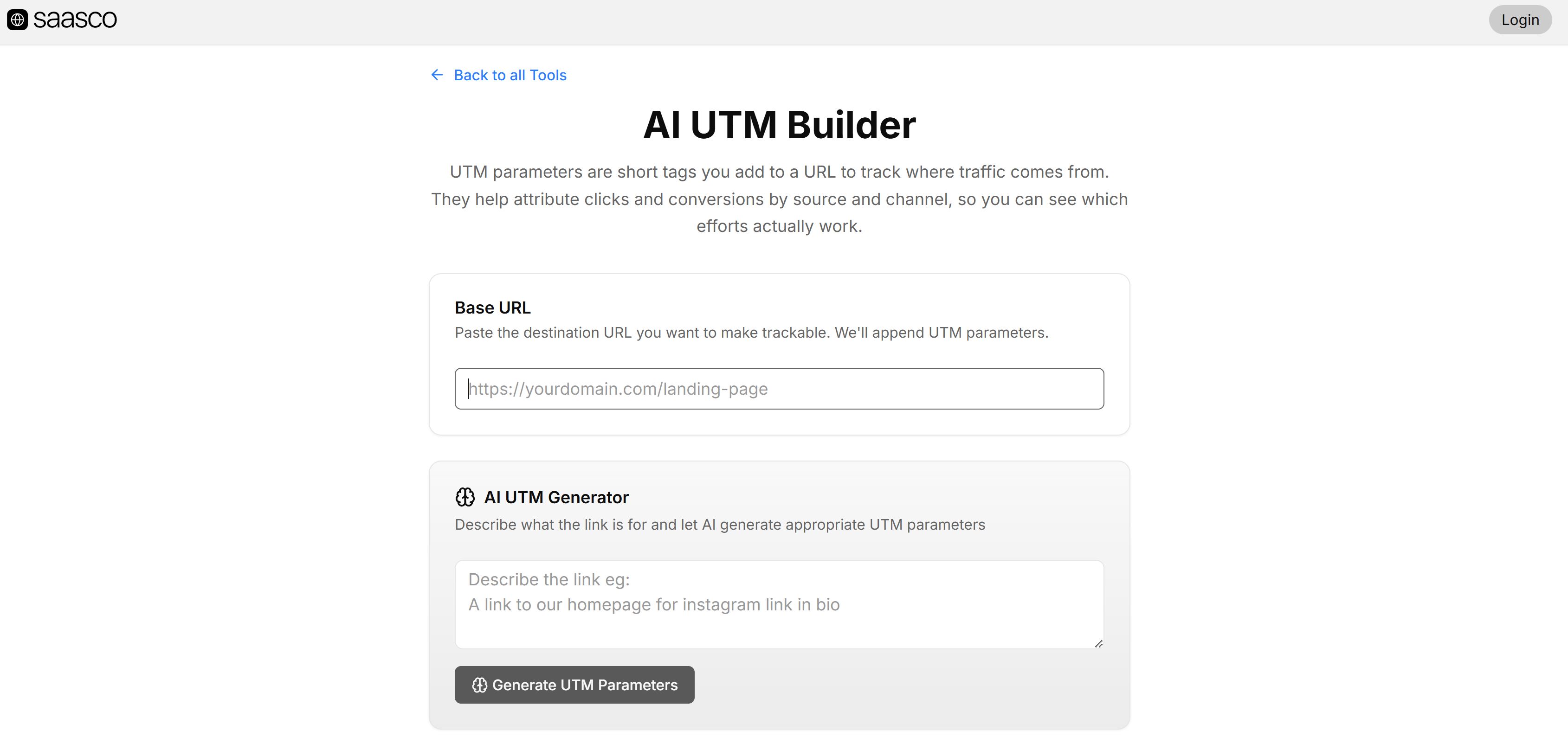 "Build your marketing links the same way you think. Describe your marketing activity and you are done. Our tool takes your intent and builds UTM tags that use industry best practices and remain consistent across users and campaigns. Free to use, no sign up required."
