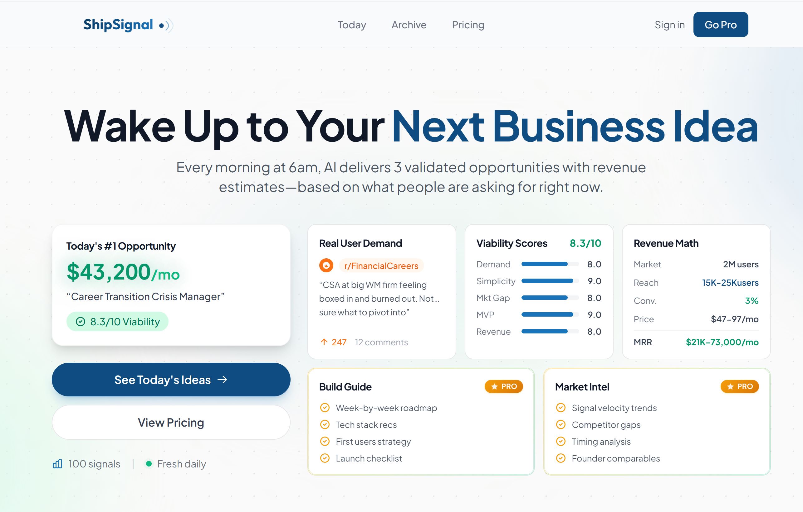 ShipSignal delivers 3 validated business ideas to your inbox every morning—scraped from Reddit and Hacker News overnight, analyzed by AI, so you can stop scrolling for opportunities and start building.