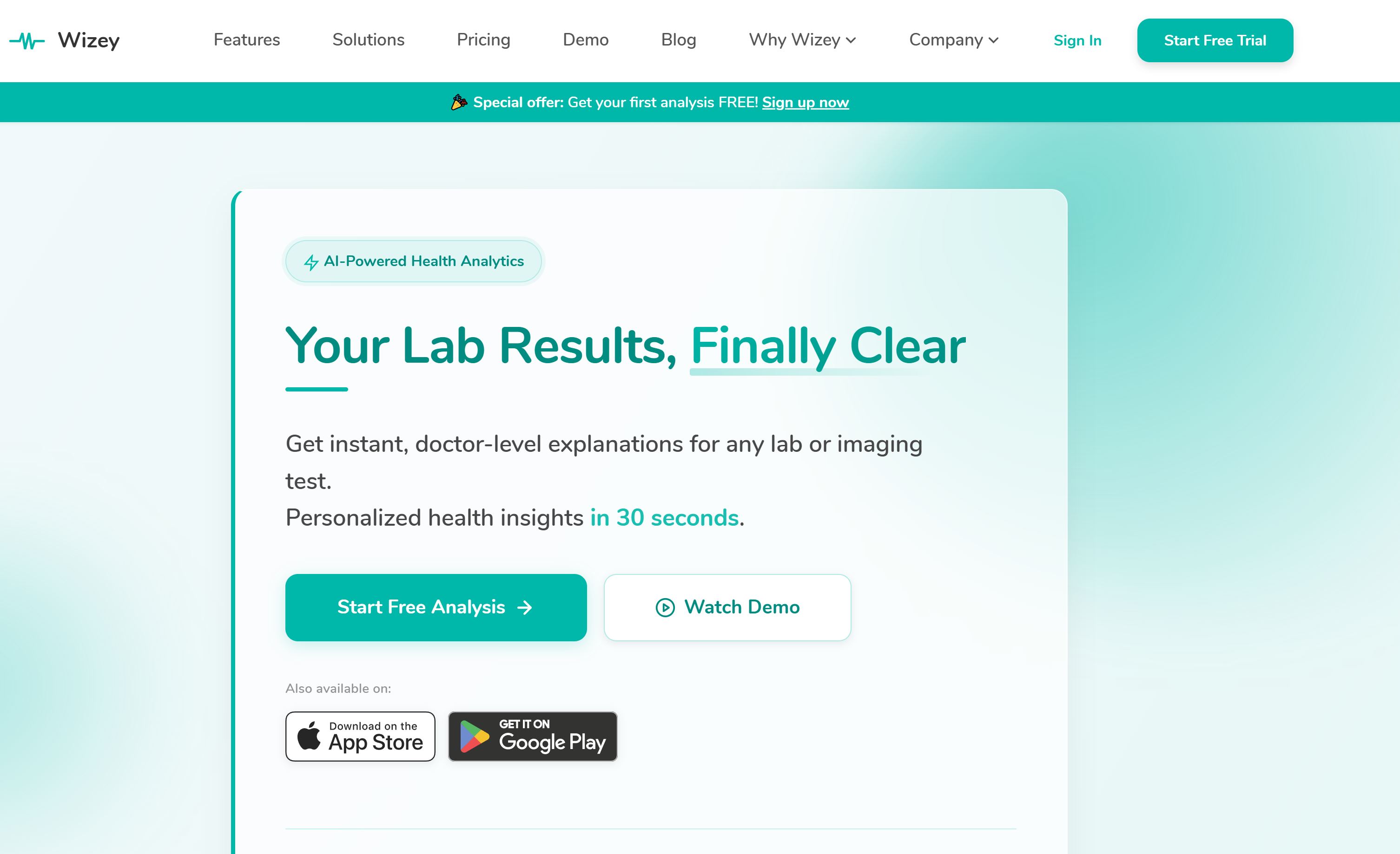 Ever stare at lab results feeling lost? Wizey turns confusion into clarity. Upload any report and get personalized, research-backed explanations in plain English. See what patterns matter, which doctor to see, and how to prepare for your appointment. Private, instant, simple.